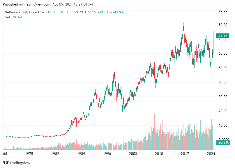At the close of the market on the previous Friday, Kellanova's market value was around $22 billion. The company's recent financial performance has been robust, with better-than-expected second-quarter results and increased guidance, buoyed by strong demand in North and Latin America. These factors have contributed to the surge in Kellanova’s stock price, which climbed to $75.00 shortly before the opening bell on Monday, marking a 29% increase since the previous Wednesday's close.