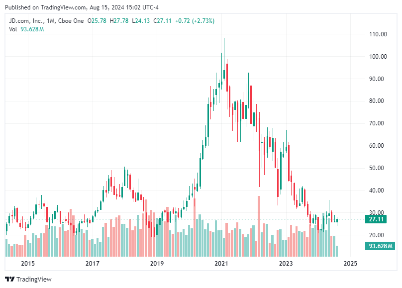 JD.com's general and administrative costs were also reduced by 9.6% during the quarter, further bolstering its profitability. Despite prioritizing a low-price strategy towards the end of 2022, which saw its share price fall from around $60 to approximately $26, the company's long-term vision appears to be paying off as it continues to capture market share in a highly competitive environment. The Chinese e-commerce market is fiercely competitive, with major players like JD.com, Alibaba, and PDD Holdings vying for dominance. The post-COVID economic recovery in China has been uneven, benefiting low-cost e-commerce platforms like PDD Holdings, which have seen an uptick in consumer interest. This has triggered a price war among the larger rivals as they aim to attract a similar customer base.