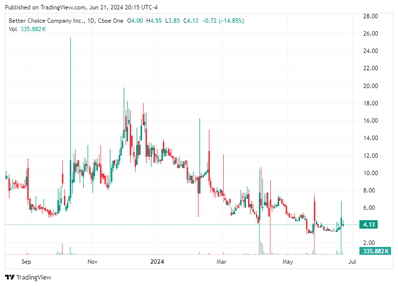 Better Choice Company Inc. is dedicated to offering pet products and services that promote healthier, happier, and longer lives for dogs and cats. The company's portfolio includes a broad range of pet health and wellness products under the Halo brand, encompassing foods, treats, toppers, dental products, chews, and supplements. With a multi-decade track record of success, Better Choice is well-positioned to benefit from the growing trends of pet humanization and consumer focus on health and wellness. The products offered by Better Choice consist of kibble and canned food for both dogs and cats, freeze-dried raw dog food and treats, vegan dog food and treats, oral care products, and supplements. Halo’s core products are made with high-quality, thoughtfully sourced ingredients designed to provide natural, science-based nutrition. Each recipe is formulated with input from veterinary and nutrition experts to ensure optimal health benefits for pets.