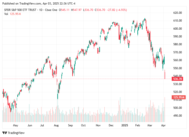 The stock market endured a turbulent session on April 3, 2025, marked by geopolitical developments, aggressive U.S. tariff policies, and corporate announcements. The S&P 500 closed down 1.8%, with the tech-heavy NASDAQ Composite plummeting 3.2% amid tariff-induced concerns. The Dow Jones Industrial Average fell 2.1%, while the Russell 2000 sank an additional 2.6%, officially entering bear market territory. Market sentiment remains anxious as investors weigh the long-term effects of rising tariffs and a potential global trade shift on corporate revenue and consumer pricing.