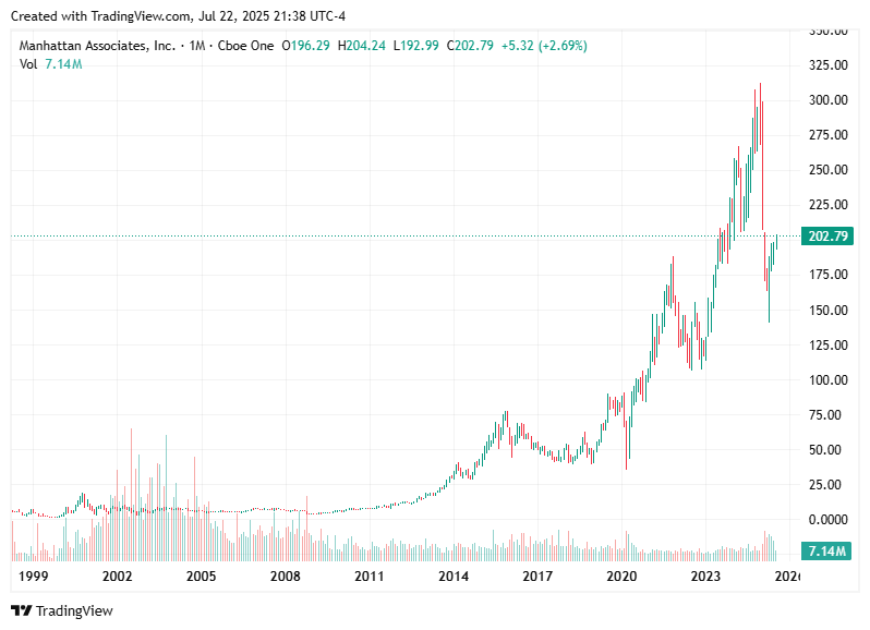 Despite a slight dip, Intuitive Surgical raised its FY25 guidance for da Vinci procedure growth. With a 17% YoY increase in Q2 placements, this stock remains a long-term growth story in robotic surgery.Manhattan Associates (MANH, $202.79, +3.06)