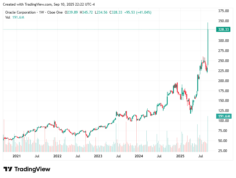 Oracle (NYSE: ORCL, $328.33, +86.82) stole the show today with a jaw-dropping 35.95% gain.