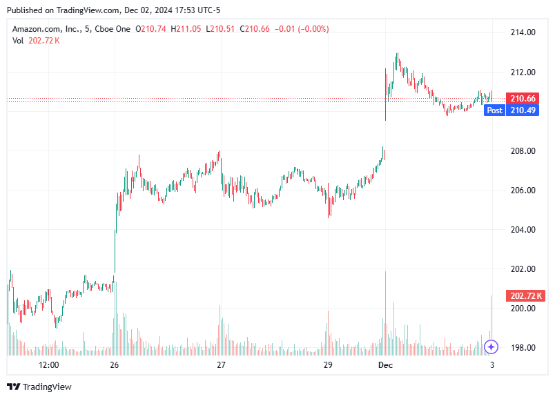 Amazon touched a high of $212.78 per share today. Its CEO for AWS promised “needle-moving” AI updates, fueling investor optimism around its cloud and AI services.