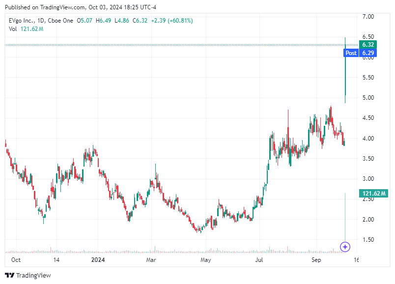 EVgo's stock has surged by 47% to reach $5.76 following the announcement of a conditional commitment for a DOE loan guarantee of up to $1.05 billion. This financial boost is aimed at accelerating the expansion of public fast charging infrastructure across the United States, aligning with the growing demand for electric vehicle support.