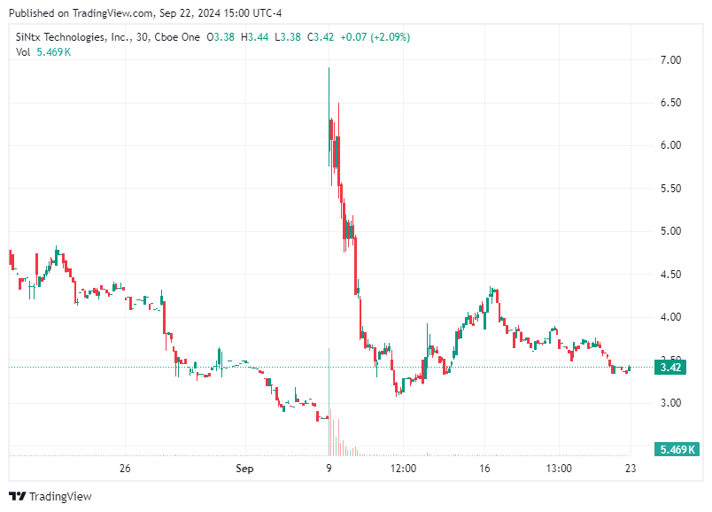 The alert for $SINT was dispatched at 8:48 AM on 9/9/24. Throughout the day, $SINT demonstrated a robust performance, peaking at a gain of 54.61%. This stock was under careful observation for its potential.