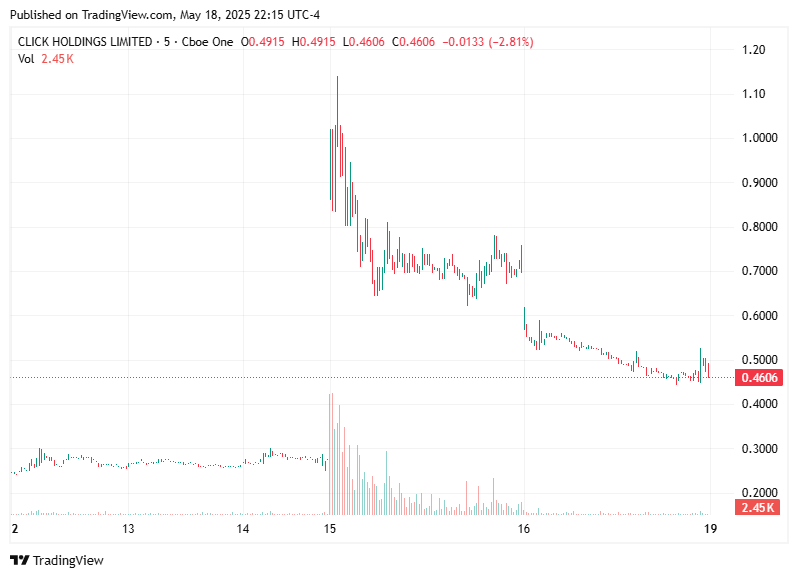The alert for $CLIK from Stock Region went live at 7:21 AM. Throughout the session, the stock experienced upward momentum, achieving a peak gain of 153.50% during the day.