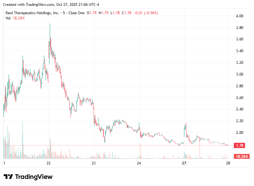 The alert for RANI was sent at 11:23 AM. Following the alert, the stock’s value decreased, finishing the day down 15.26%.