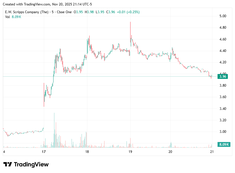 An alert for $SSP was sent to members at 8:57 AM. Following the alert time, the stock experienced significant upward momentum and saw its price increase throughout the trading session, reaching a high point of (+) 39.87% on the day.