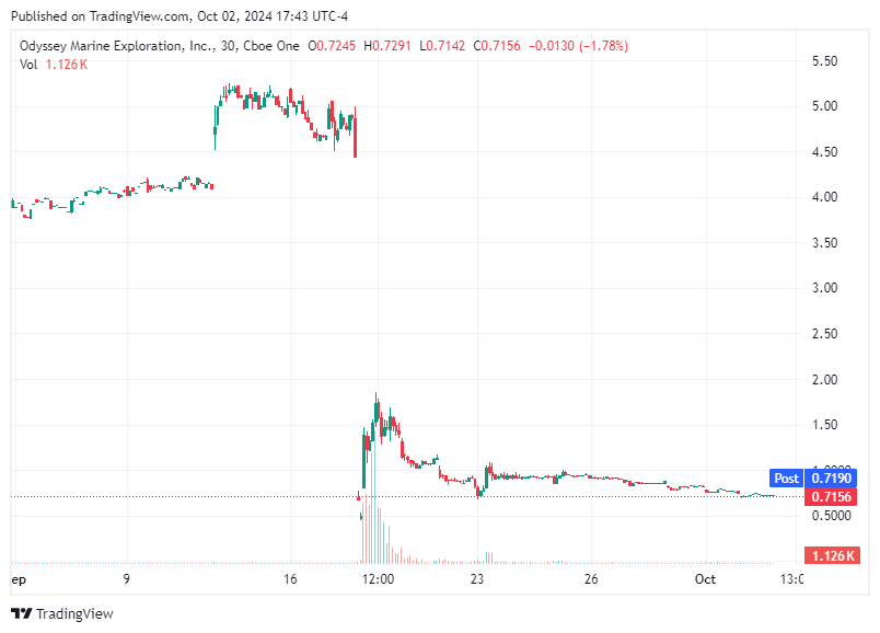 The alert for Odyssey Marine Exploration, Inc. ($OMEX) was issued at 9:48 AM on 9/18/24, with the stock experiencing an impressive increase of 182.09% throughout the day.
