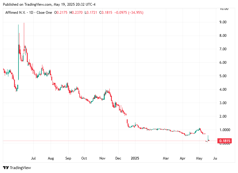 The alert for $AFMD came in at 9:34 AM on May 16, 2025. Throughout the trading day, the stock climbed significantly, reaching a high percentage increase of 227.85%.