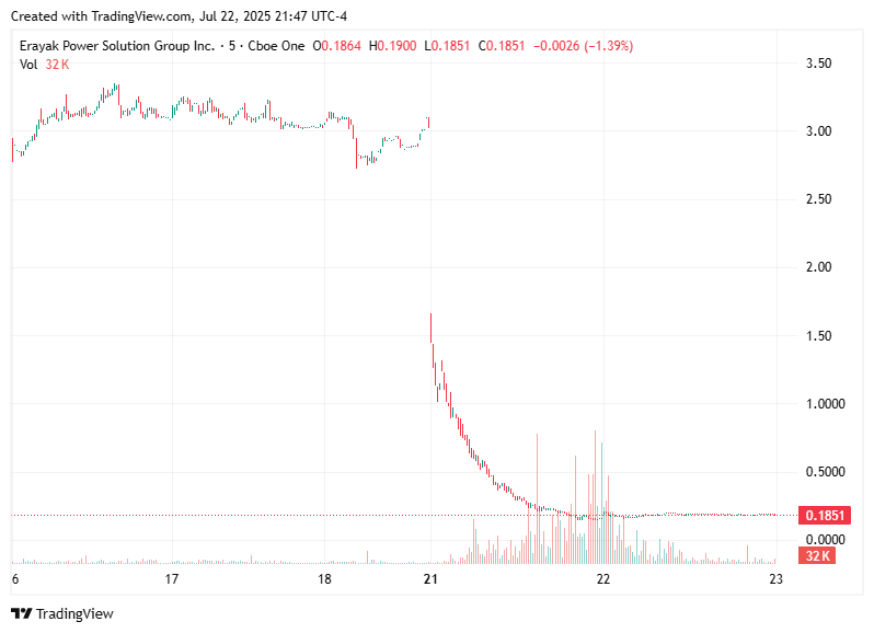 $RAYA’s alert entered the trading platform at 3:04 PM. However, this stock exhibited a downward trend after the alert, experiencing a substantial decline of 94.77% through the day.