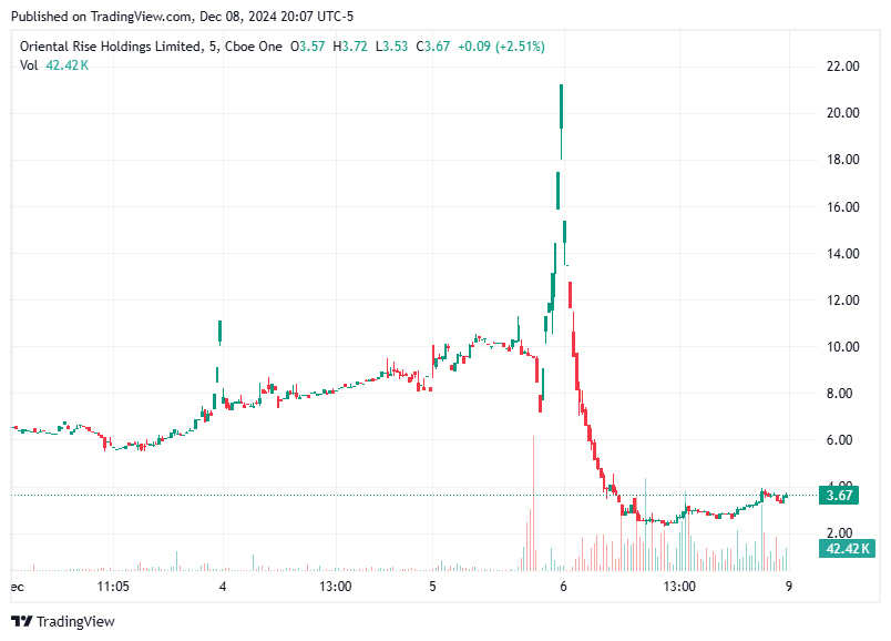 The alert for $ORIS was sent at 4:02 PM on 12/5/24. Following the alert, the stock displayed significant movement, reaching a marked high later in the day’s trading session. It was closely monitored as part of a day/swing trading strategy.
