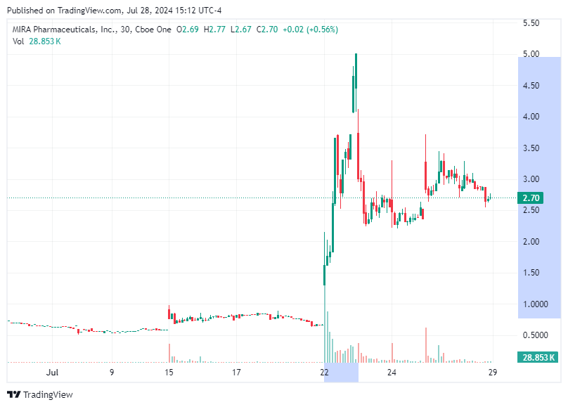 $MIRA showed a notable increase of 627.35% after our alert was sent. Throughout the day, the stock maintained a high performance, reaching significant highs as it fluctuated within day/swing trade patterns.