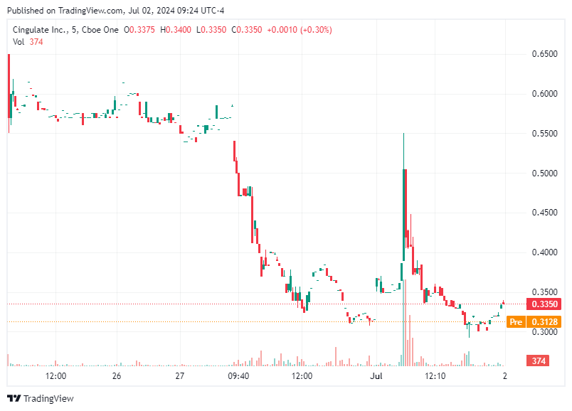 Alert Time: 10:49 AM Cingulate Inc. showed an increase, peaking at 7.50% after the alert, attracting attention from day traders.