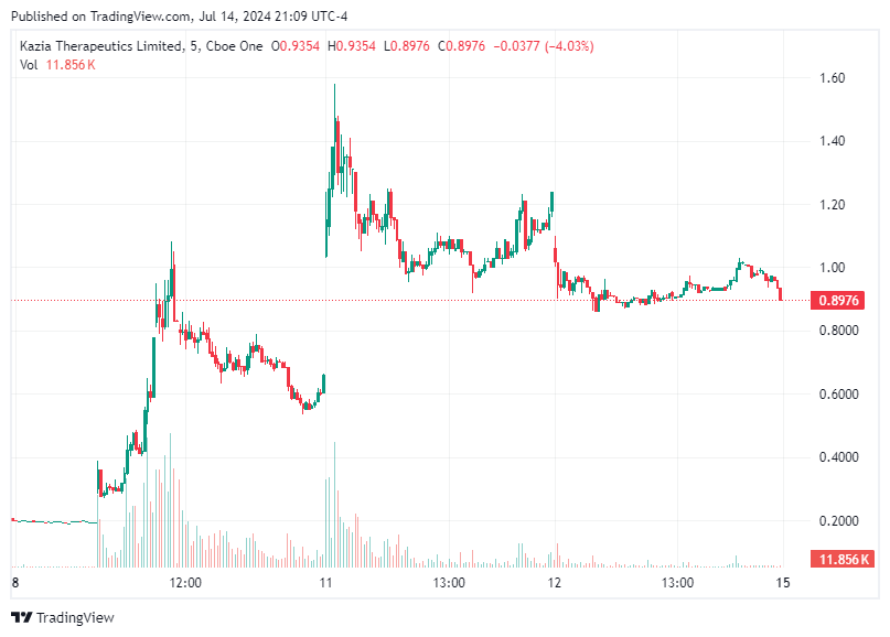 Kazia Therapeutics Limited (KZIA) saw a substantial movement throughout the trading day. The stock experienced a notable rise of 248.02%, reaching its high as it trended positively. This activity marked it as a significant day/swing trade opportunity.