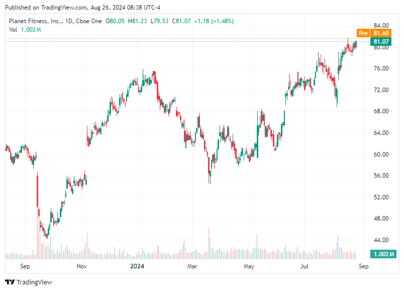 Planet Fitness has reported a healthy 5.1% increase in total revenue for Q2 2024, underscoring its solid growth trajectory. With an optimistic outlook and a new growth model enhancing returns, Planet Fitness stands out for investors keen on the fitness sector's resurgence and expansion. For short-term trading, monitor the downside level at $81.07, as falling below this could indicate a potential pullback.