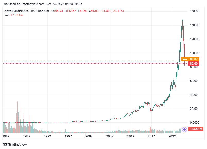 Recent News: Shares of Novo Nordisk took a hit after the company announced disappointing results from a late-stage trial of their next-generation obesity drug, CagriSema. The trial showed lower-than-expected weight loss outcomes, leading to a significant drop in its market value.