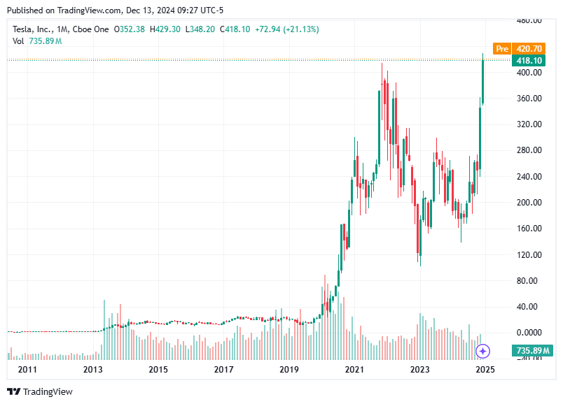 Tesla has hit a new record high, showing an impressive 69% increase since the U.S. presidential election. Market optimism continues to fuel its growth, and potential regulatory benefits under the new administration are adding to investor confidence. Tesla's focus on artificial intelligence and autonomous vehicles has analysts raising price targets, highlighting its expanding influence in future-forward technologies.