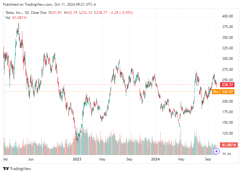 Tesla's unveiling of the Cybercab robotaxi fell short of investor expectations, resulting in a dip in its stock price. Despite this, Tesla's continuous innovation and market influence make it a compelling stock to watch. The company has shown remarkable recovery throughout 2024, presenting both opportunities and risks. Traders should be alert to levels above $226.70 for the upside and $222.61 for the downside.