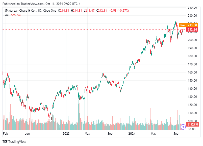 JPMorgan's third-quarter earnings surpassed both profit and revenue estimates, fueled by higher interest income and investment banking fees. CEO Jamie Dimon's remarks on the bank's strong performance amid challenging economic conditions highlight JPMorgan's resilience and strategic positioning. Investors should watch for regulatory changes and geopolitical risks. Key levels to monitor include $217.91 for upside potential and $212.90 for downside protection.