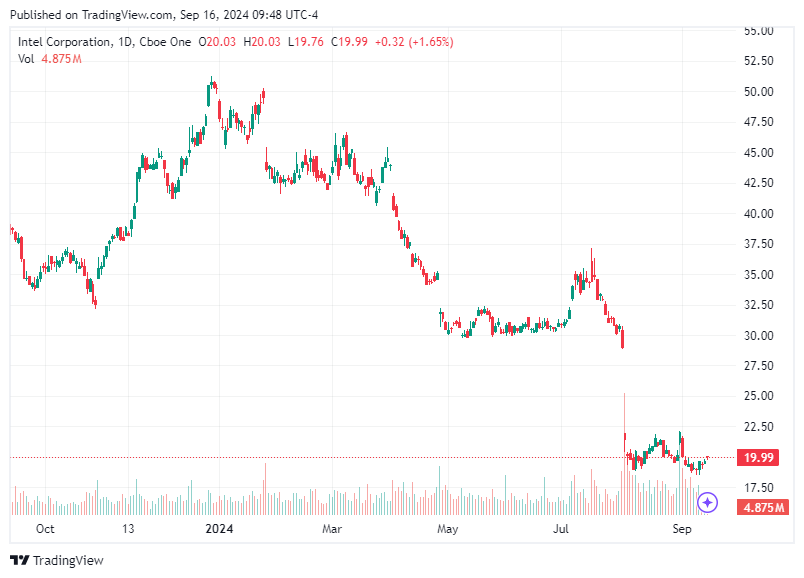 Intel has faced a challenging year with a notable decline in stock value. However, there's been a recent uptick as investors speculate on a substantial Federal Reserve rate cut. This could indicate the beginning of a turnaround, or at least a short-term trading opportunity. Watch for an upside above $20.43 and a downside below $18.83.