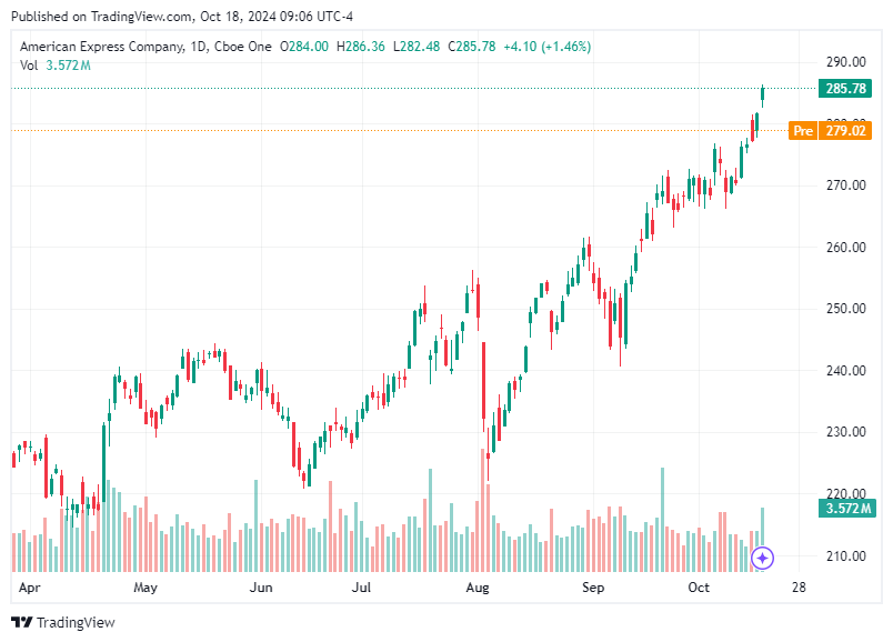 American Express is making waves with its recent strong financial performance. The company has seen a boost in earnings, thanks to a surge in consumer spending and travel activities. This trend is likely to enhance investor confidence. In the digital payments arena, American Express is at the forefront, benefiting from a market shift towards online transactions for both consumers and businesses. The company's strategic initiatives in digital innovation and expanding partnerships offer potential for further growth in the competitive payments industry. Keep an eye on the short-term levels, with an upside potential above $282.49 and a downside below $275.93.