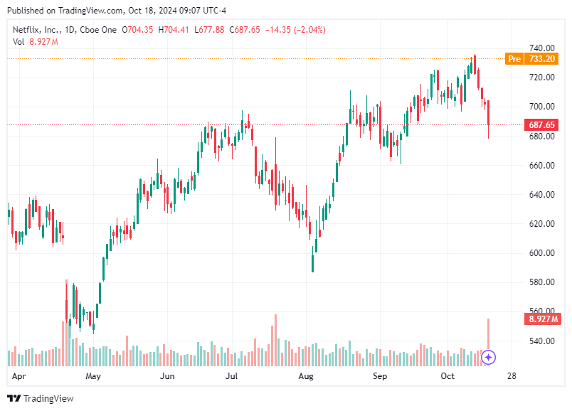 Netflix has surpassed third-quarter expectations, bolstering its growth prospects with impressive earnings and revenue figures. The notable 35% rise in ad-tier memberships highlights the company's successful revenue diversification, which could enhance future profitability. Netflix plans to expand its ad-tier service into Canada and other international markets by 2025, offering exciting growth potential. Investors should monitor the stock for short-term trading opportunities, with an upside above $734.40 and a downside below $720.00.