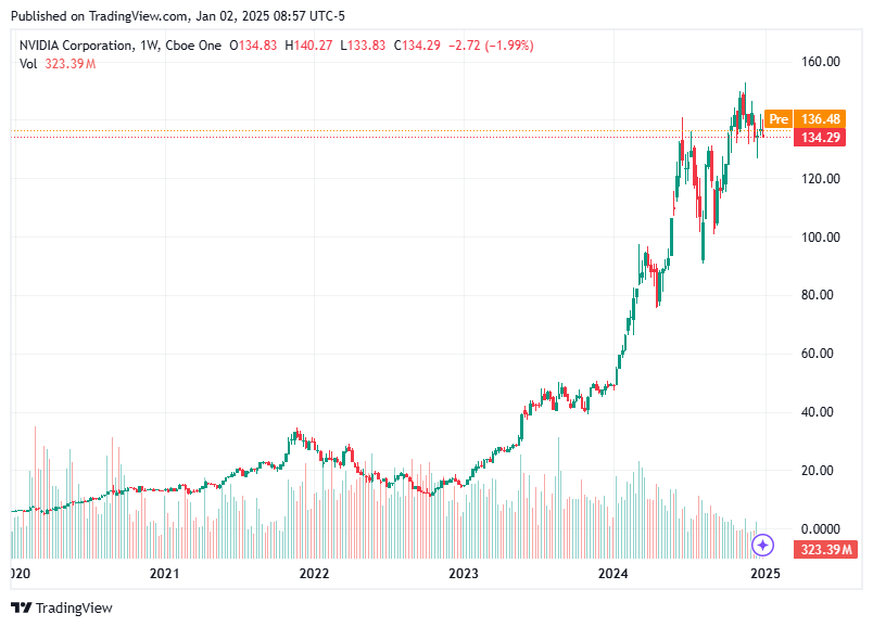 Nvidia is kicking off the year on a high note, climbing 1.7%. Analysts are bullish, describing the company as being in a "nirvana" moment, with strong momentum moving into 2025. Nvidia’s impressive growth trajectory could even put it in position to become the most valuable company globally if current trends persist.