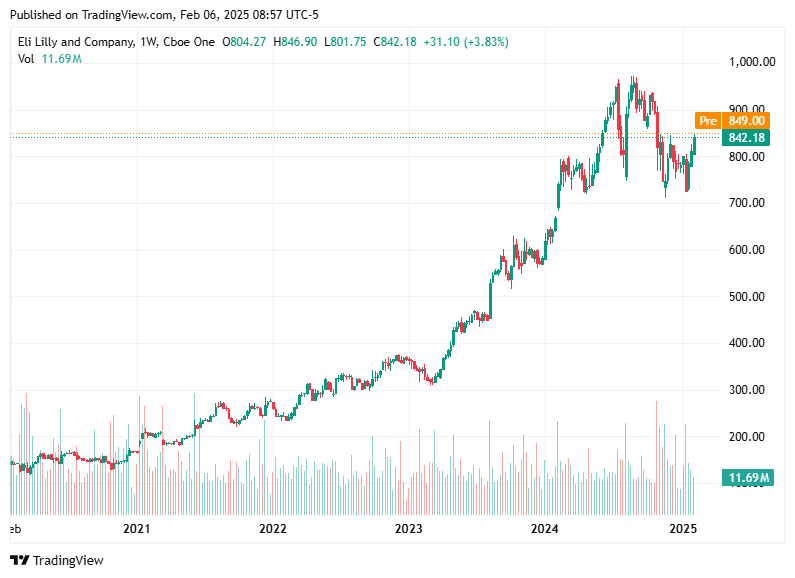 Eli Lilly continues to lead the pharmaceutical sector with Q4 revenue growth of 45%, reaching $13.53 billion, driven by blockbuster drugs like Mounjaro and Zepbound. For 2025, the company forecasts revenue between $58 billion and $61 billion and EPS in the range of $22.05 to $23.55. Lilly’s robust drug pipeline is bolstered by recent FDA approvals, including Zepbound for obstructive sleep apnea and Omvoh for Crohn's disease. Analysts see huge potential in Lilly's weight-loss treatments, part of a market projected to reach $150 billion by the next decade.