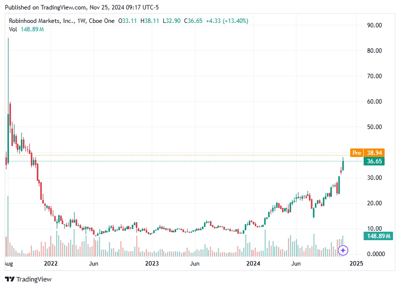 Recent Performance: Robinhood has been on a remarkable run, with its stock climbing 45% since Election Day. This marks its highest closing price in over three years.