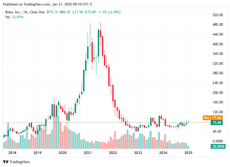 Streaming giant Roku shows promise, with analysts projecting a 41% upside in 2025, thanks to the expansion of its platform segment. The stock is already up 12% this year, driven by strong trading volume, new partnerships, and product innovations. While it faces stiff competition, Roku’s market momentum is worth watching.