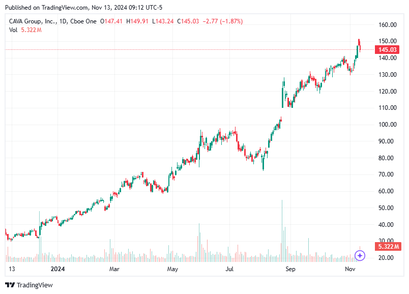 CAVA Group has made impressive waves in the market, with its stock surging nearly 17% following a stellar third-quarter earnings report. The company has experienced a remarkable 39% increase in revenue, totaling $241.5 million compared to last year. This robust performance has led CAVA to elevate its annual sales forecast, buoyed by strong consumer demand. As we monitor short-term movements, keep an eye on the upside level above $171.50 and downside below $165.89.