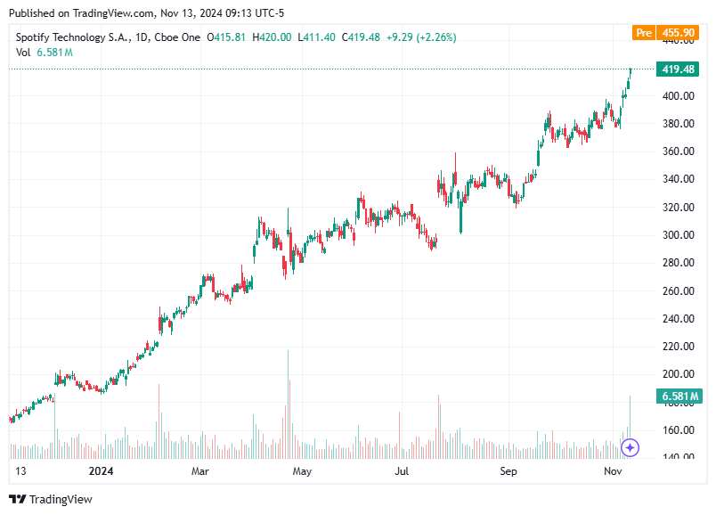 Spotify continues to resonate positively with investors, reporting an 11% year-on-year growth in monthly active users, surpassing expectations in its third-quarter results. CEO Daniel Ek emphasizes Spotify’s unprecedented strength, underscoring the company’s solid market presence. Financially, the company has posted favorable results, positioning it well for future growth. Short-term levels of interest include an upside above $458.31 and a downside below $443.55.
