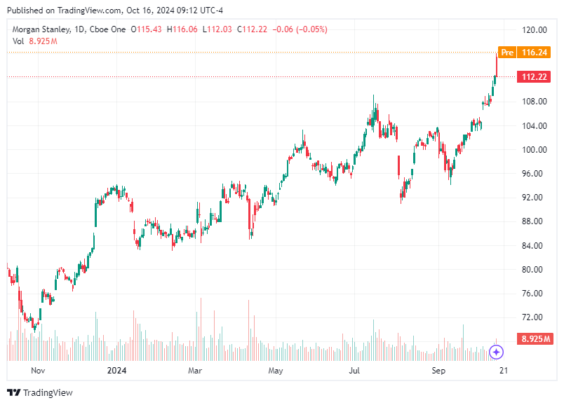 Morgan Stanley has captured the market's attention with a compelling earnings report. The financial giant exceeded expectations in its recent third-quarter earnings, posting a profit of $1.88 per share, surpassing the anticipated $1.58. Revenue also outperformed forecasts, reaching $15.38 billion against the expected $14.41 billion. This stellar performance has propelled Morgan Stanley's stock to new heights, marking an all-time high.