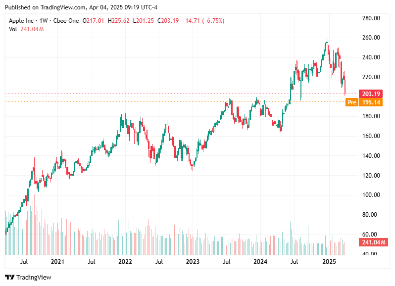 Impact of Tariffs: The recently announced 10% blanket tariff on imports, alongside a steeper 34% rate for imports from China, is creating substantial pressure on Apple's stock price. This policy shift has already resulted in a notable decline in its valuation.