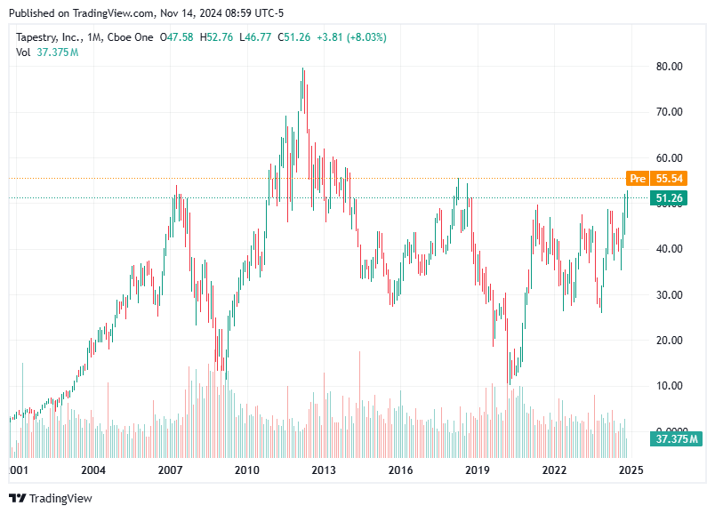 Tapestry has made headlines by terminating its merger with Capri Holdings and unveiling a $2 billion share repurchase program, which has been well-received by the market. This strategic shift towards organic growth and maintaining its dividend positions Tapestry favorably among investors. Short-term levels to watch include an upside above $56.15 and downside below $51.26.