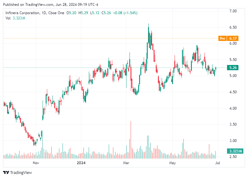Investor Reaction to Political Climate: Tech stocks are often responsive to changes in regulatory environments. Discussions about cybersecurity, data privacy, and tech regulations during the debate could impact investor sentiment toward Infinera. Levels to watch out for: upside above $6.33, and downside below $6.23.
