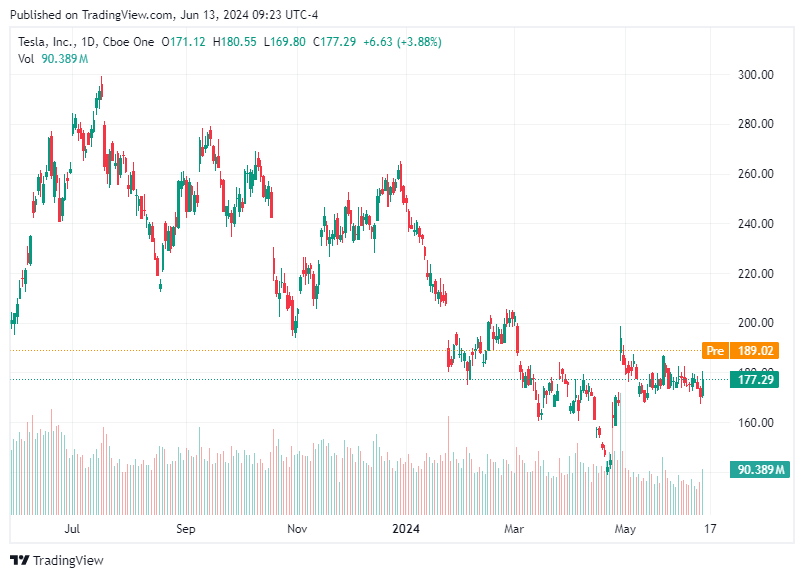 Tesla remains a stock to watch closely this week due to several potential catalysts. Firstly, new product announcements could be on the horizon as Tesla often makes impactful reveals of vehicle models or technology updates. Additionally, investors are keenly watching for quarterly production and delivery reports; any figures that exceed expectations could drive the stock higher. With the second quarter nearing its end, updates on Tesla’s financial performance may influence market movements. Moreover, news about Tesla's market expansion, such as opening new gigafactories or entering new sales regions, can attract investor interest. Finally, technological innovations in autonomous driving and battery advancements are areas that typically garner significant attention. Key levels to monitor include an upside above $190.00 and a downside below $185.70.